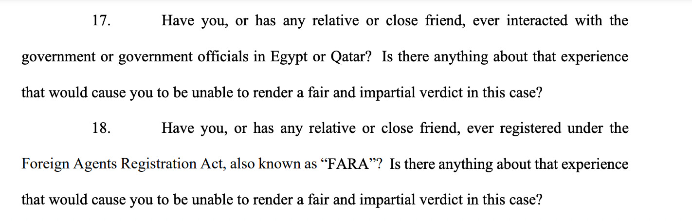 In American jury trials, lawyers from both sides work together to pick an acceptable jury. The U.S. government’s proposed questionnaire for potential jurors starts with boilerplate legal questions. But then it takes a very interesting foreign policy turn.
