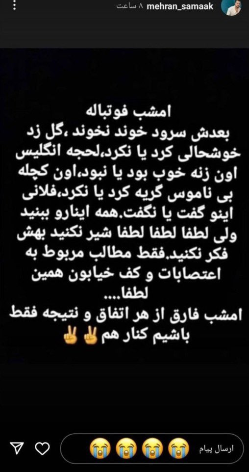 Samaak had every reason to watch, because his childhood friend Ezatolahi was playing as defensive midfielder. But he didn’t care who won or lost. As he wrote in an Instagram story:
