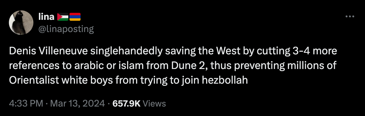 The New Arab and New Lines Magazine did run articles about Dune’s “appropriation” of Muslim aesthetics in the shadow of Gaza, without addressing the content of the film. They missed the point, because Dune is a story that deeply engages with Islamic history even as it remixes it.